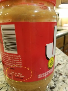 My final exhibit is one of 3 (THREE) large (LARGE) jars of Jif peanut butter. It’s set to expire in August of 2018. The other two jars, same thing. I can quite accurately predict that all three of these jars will be history in probably less than 2-3 weeks. I consume approximately 1 tablespoon every 4 or 5 days. Tops.