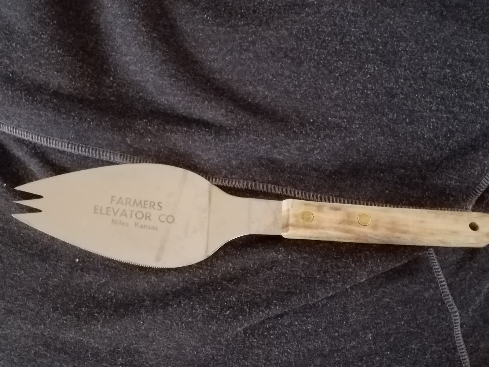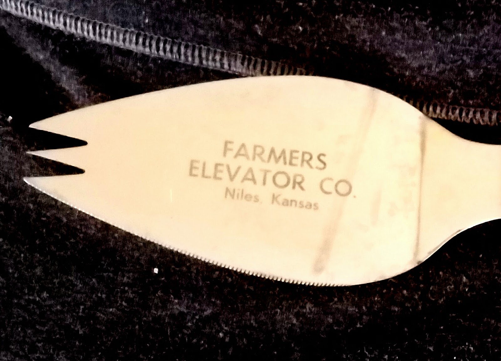 But my favorite part of this treasure is the words engraved on the spatula: FARMERS ELEVATOR CO. Niles, Kansas. Is there still an elevator in Niles, Kansas? If there is, it’s probably the last remaining business in that small stop in the road. Back in the first decade or so of my parents’ married life they resided just a couple miles down the road from Niles and bought groceries there. Niles probably never qualified as a booming town of any sort, but it’s sure enough just a stop in the road now. Many folks belonging to my family heritage are buried in the cemetery there.