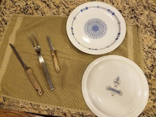 At first glance this just seems like a random collection of insignificance. Not so in B’s simple world. These are treasures handed down from my mother’s kitchen to me after her death in 1993. The plates are her last purchase from one of the dinnerware sales that Boogaarts had back in the day. You know, you spent X amount of dollars on groceries and got a plate real cheap? I love this plate pattern but she only was able to buy a couple plates before her health failed and she passed away. I’ve found selections of this particular pattern of dinnerware (see the picture of the back of the plate for details) on EBAY and someday I may choose to part with the coins required to purchase the rest of the set. In the meantime, on special meals for me and my beloved I pull these two plates out. The knives and fork were part of the free gifts you would get at the Citizen’s National Bank when you deposited money in savings. Clearly Mom didn’t have a lot of money to deposit as these are the only gifts she received. But these are awesome knives! She probably got them back in the 1970’s and they are still sharp and quite useful. You can’t underestimate the value of a good knife. My favorite one of my favorite sons-in-law and I were just discussing this fact when we were preparing the Christmas meal last week. Yes, WE!! He’s an awesome cook!!