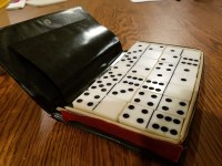 My dad’s old set of dominoes. Circa 1960 or so. Check out the red duct tape that holds the original packaging together and has held up for decades. And we use a rubber band to close it as the original snap is history. I can’t even begin to tell you all the wonderful memories this set of dominoes generates. So many hands have touched these dominoes. If these dominoes could talk, they’d tell you about a lot of laughs and fun times. And I might add, a lot of “you played that wrong” from my Dad.