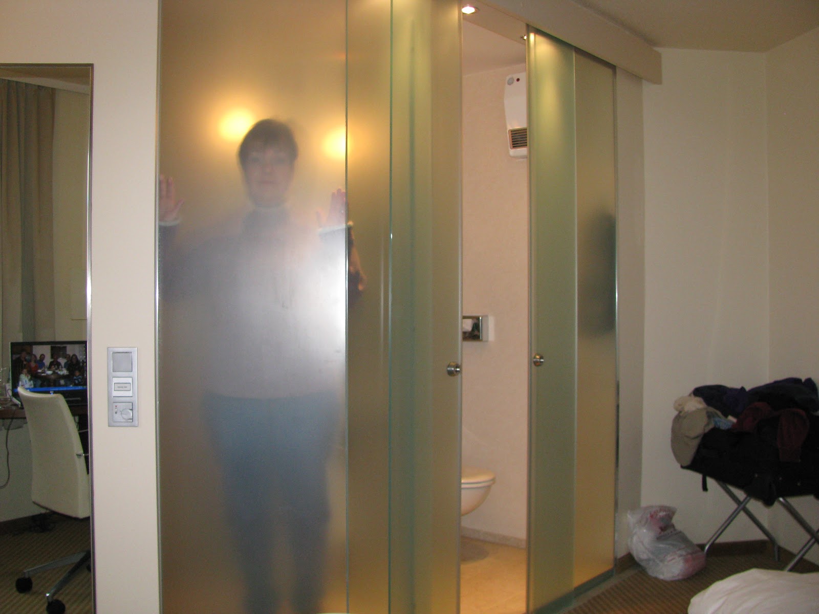 We found hotel rooms in Germany to be quite a bit larger and more comfortable. Our first hotel room in Weisbaden was in an older building. In the process of updating the old hotel to be modern, they needed to add bathrooms to each hotel room. To do that, they simply put the toilet, shower and sink inside a glass enclosure close by the beds. Yes. If you were sharing a room with another person, or happened to have visitors in your room…. all bathroom activity was visible. Granted, the glass was slightly frosted, but still. To clarify, I am fully clothed in this picture as I stood in the shower to take my own picture: