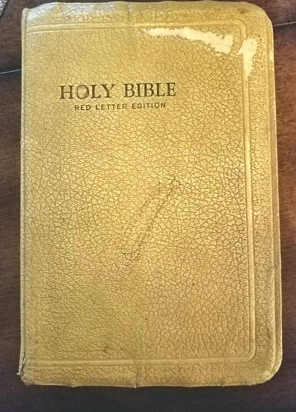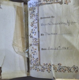Holy Bible, King James Version. With my mother’s handwriting on the “presented to” page. She even used my formal name, not “Bunny”. You may notice that the book is pretty fragile, being held together by tape.