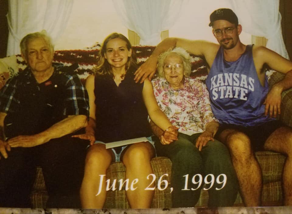 My very favorite memory of time spent with Grandpa & Grandma Conrow was a beautiful fall day during Kansas State football season. We had made the trip over to the farm with DeWayne’s folks for a visit. Grandpa would always be glued to the radio listening to every play of every KSU game. He was the living definition of avid KSU fan with purple blood running through his veins. And a walking team statistician. He knew his Wildcat sports. On that particular day, we opted to take the radio outside and listen to the game together. We sat in lawn chairs and the tree swing, ate a picnic of Dillon’s chicken with side dishes, and listened to the game. Glorious sunshine and blue skies, calm winds. Bliss, right there on Hunter’s Island. A memory I will treasure forever.