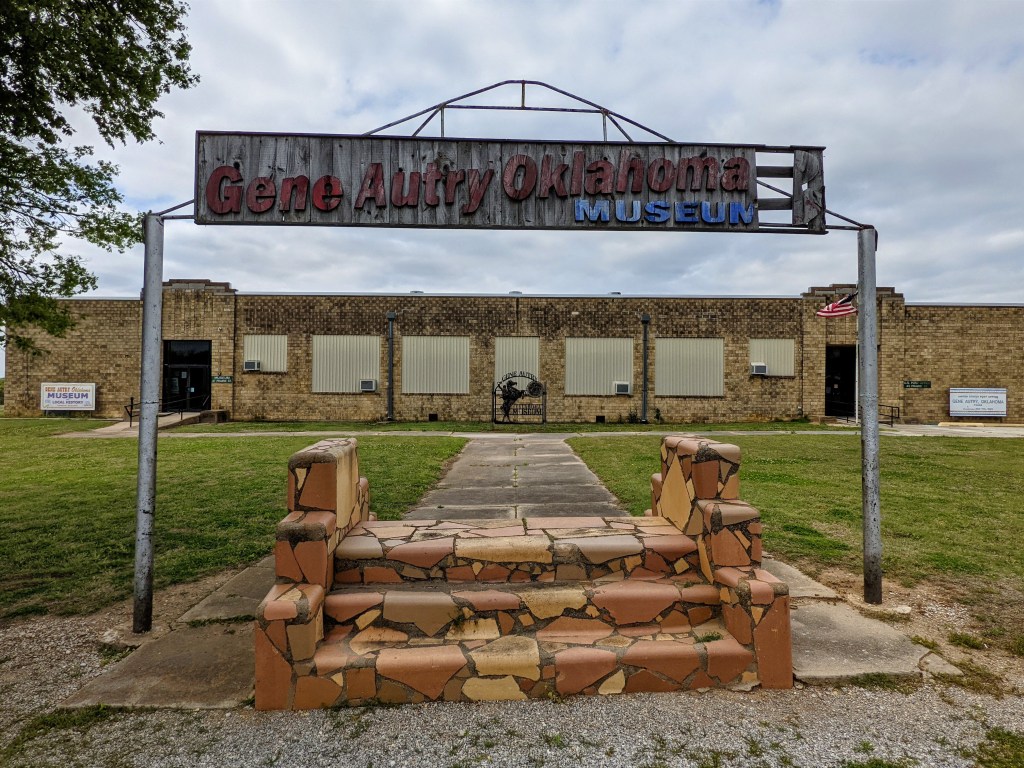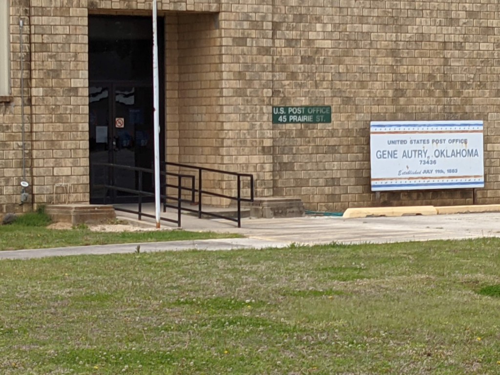 The only day with less than stellar weather we decided to take a little drive from our campsite in Buckhorn Campground over to a town on the map called Gene Autry, Oklahoma, and then on to Tishomingo, Oklahoma where Blake Shelton lives. Gene Autry was named after…..uh……Gene Autry. His hometown. There’s not a lot there. Population is 153, up from 99 in the year 2000. Along with the Gene Autry First Baptist Church, there’s a Methodist Church too. And the Gene Autry Museum which was closed, reportedly due to COVID-19. And the Gene Autry Post Office which is in the same building as the Museum. Apparently mailing letters isn’t as risky as walking through museum artifacts.