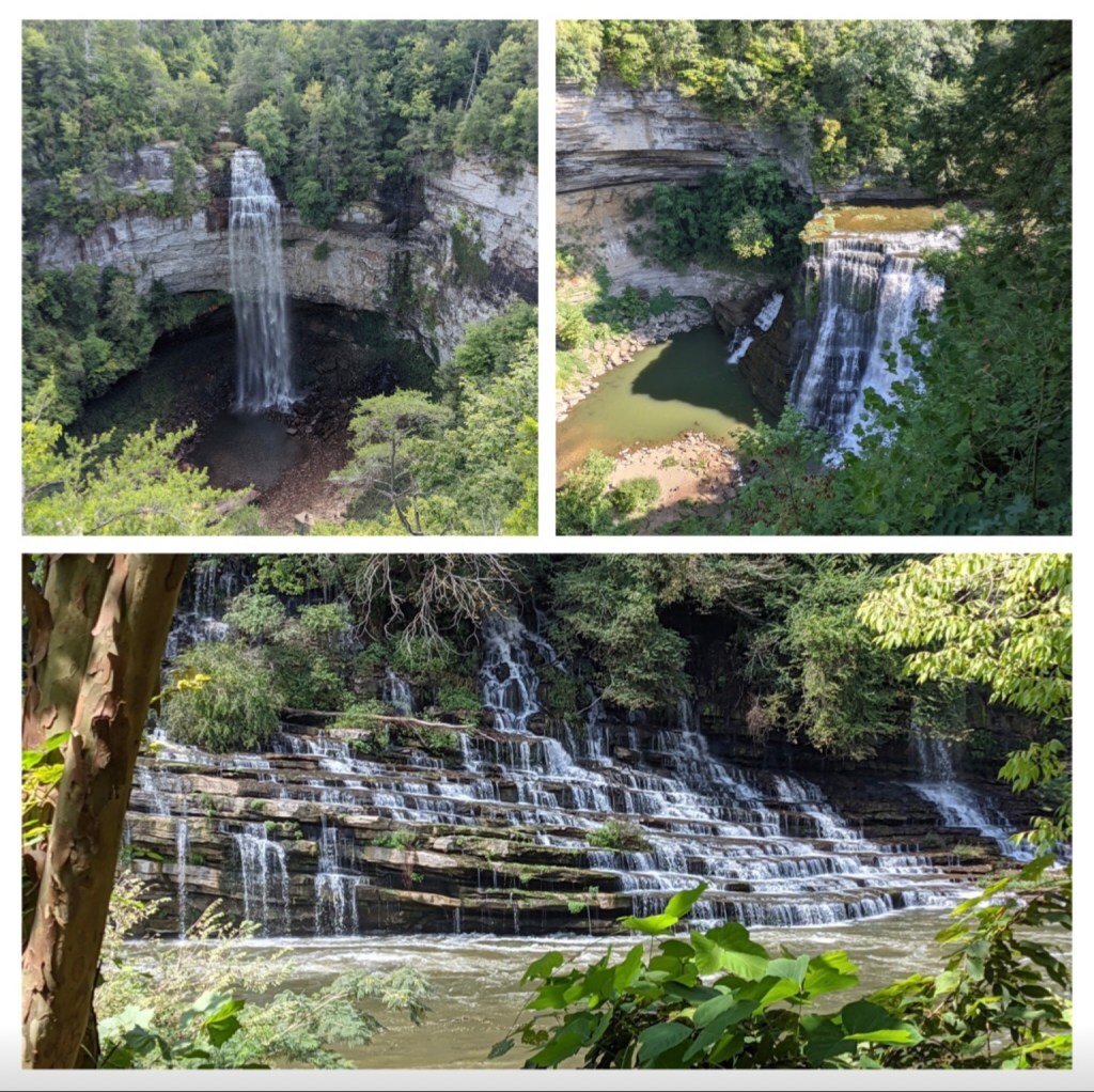 The upper left waterfall is Fall Creek Falls near Sparta, Tn. 256 feet drop and stunning!!! There are two people standing on a rock at the bottom of the picture near the trees. Top right is Burgess Falls. Bottom right is Twin Falls in Rock Island, TN.
