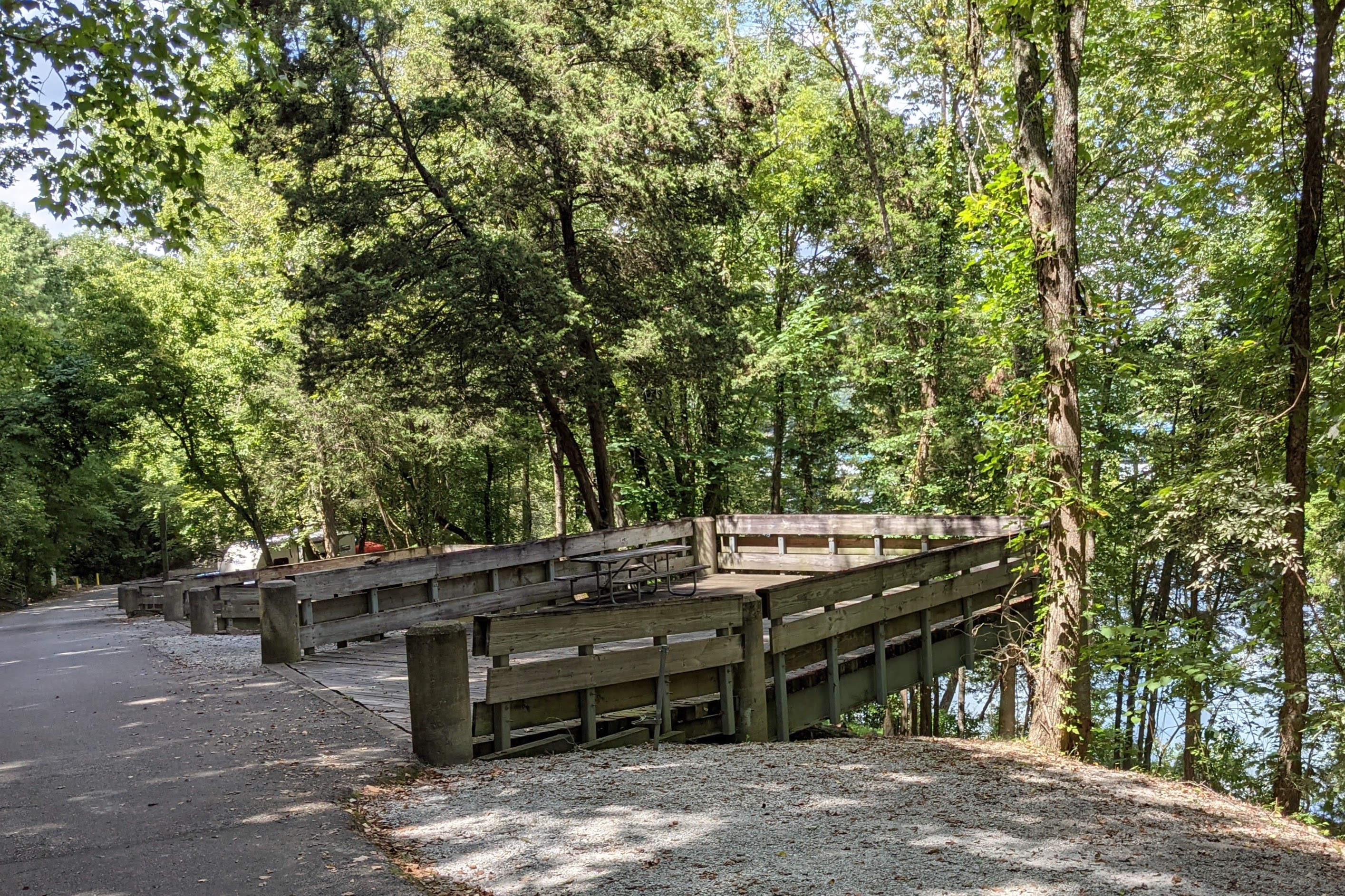 Every single campsite was on decking connected to the narrow winding camp road, high above the lake. I cannot imagine parking our camper in one of these spots. But there were some sizeable motorhomes in some of the sites.