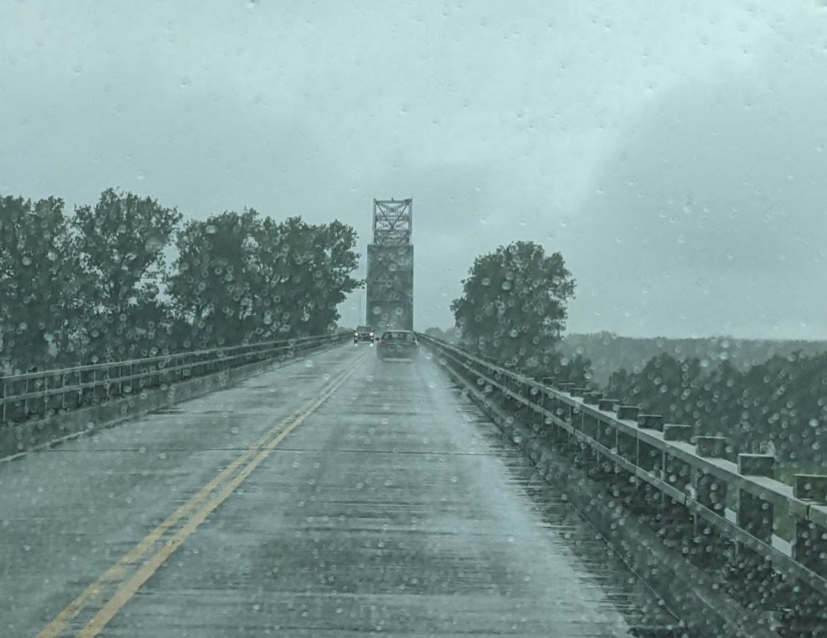 You undoubtedly don’t need me to tell you this, but the Mr is the driver of our truck towing our fifth wheel, and I am the passenger. Wisdom tells me that one day I should at least attempt to get behind the wheel. You never know what might happen and I’d need to drive…. yeah, I don’t want to think about stuff like that. And honestly I’m not just a passenger. I, uh, tell him where to go. Gently? I try. π Google Maps Lady has historically been in charge of navigating but after this trip, she and I are no longer on speaking terms. I haven’t fired her completely, but she took us and our F350 towing 36 foot fifth wheel to places that a Smart Car wouldn’t fit. In torrential rain. Over the Mississippi River by way of two lane bridges that scream “rickety”. Rough road, narrow lanes, heavy rain. And you can’t see in this picture below, but the bridge is not flat. You drive up quite a slope and then back down again. Over the Mighty Mississippi River. I texted our youngest daughter at that point in time and asked her to tell everyone we know that we love them. And to tell them to meet us in Heaven please. Was the driver nervous and scared?