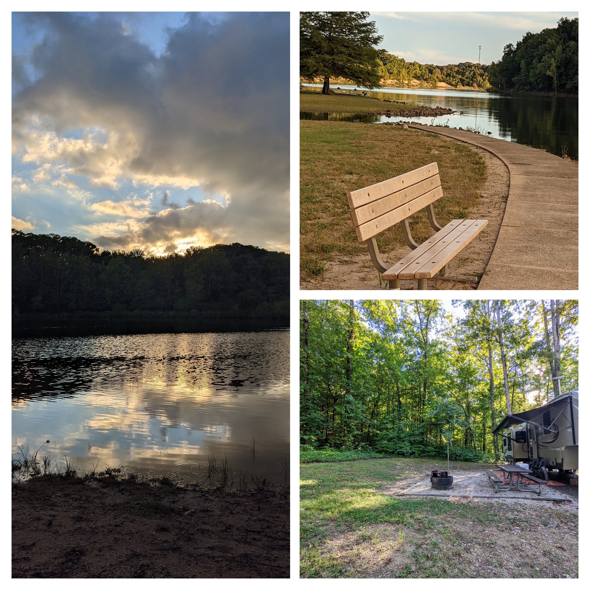 We stopped overnights at several RV parks, our favorite being a Corps of Engineers park on Lake Wappapello, Peoples Creek COE. It was so beautiful, but again, Google Lady tested us mightily by taking us on a quite circuitous and cumbersome route 35 miles out of the way, through obscure streets in tiny towns. People stopped and stared, like “what are you doing HERE?” The gate attendant at the COE said “Why on earth did you go that way???” when we told him it was quite a ridiculous trip getting there. He advised us about a better way upon leaving. Twenty miles less travel. In a related story, I’m in the market for a good road atlas. Paper and ink. π But isn’t Lake Wappapello lovely?: