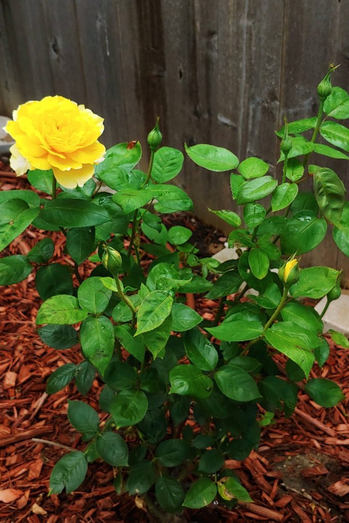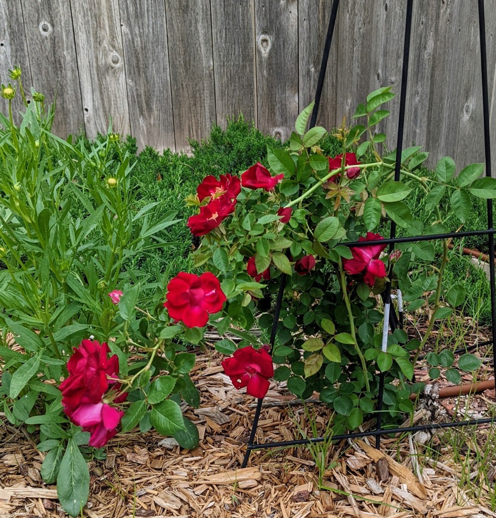 Early in the year 2020, we were gifted this lovely yellow rose bush from friends of ours. Isn’t it gorgeous? Well, Simply B and her husband aren’t really rose bush experts. In 2021 the plant did not green up at all. Not. At. All. Just a pitiful plant corpse, left to die. We didn’t bother digging it up as it wasn’t in the way of anything. And then, this year, 2022, check out Exhibit B. Same rose bush. Yes, same rose bush. Vining and blooming with lovely red roses.
