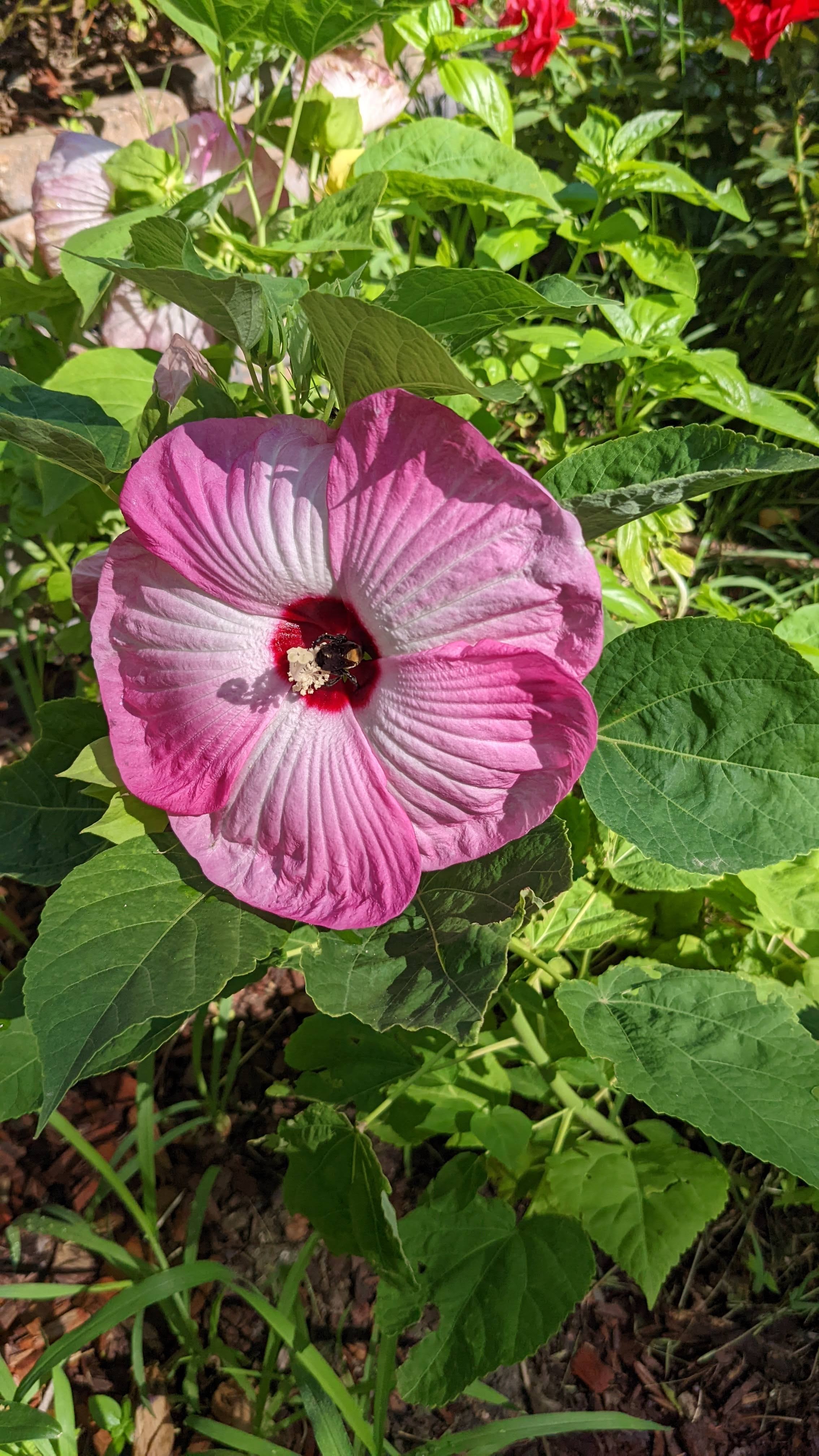 And…. this is how God spoke to me today. I had actually wanted to buy a hibiscus plant for this area but we ended up not buying any bedding plants this year. So God did this for me! How? There’s never been a hardy hibiscus plant anywhere in our yard, or neighbor’s yard to my knowledge. It’s simply an absolutely stunning, breathtaking gift. The colors, the texture, how does God do this?? Do you see the bee dining on this flower? How cool!!
